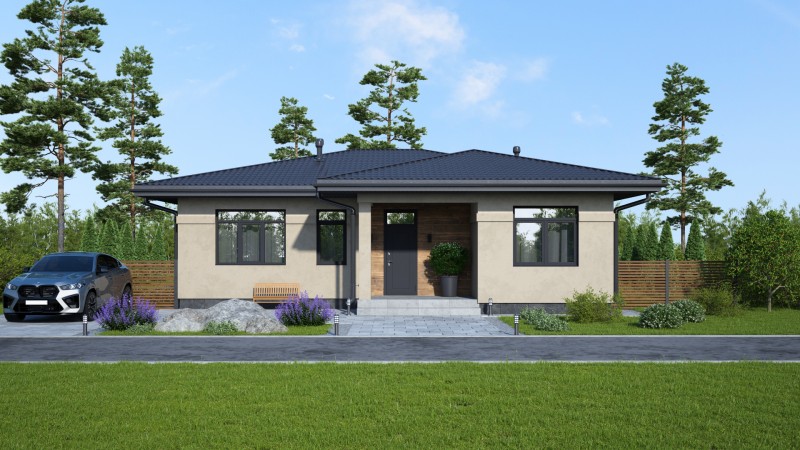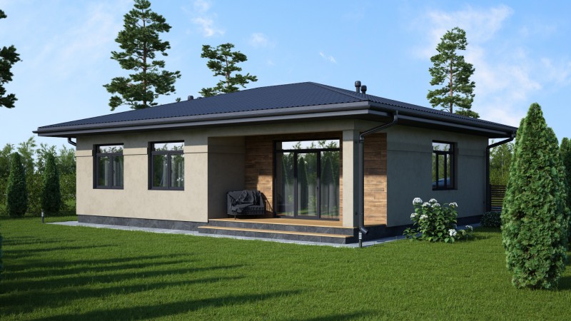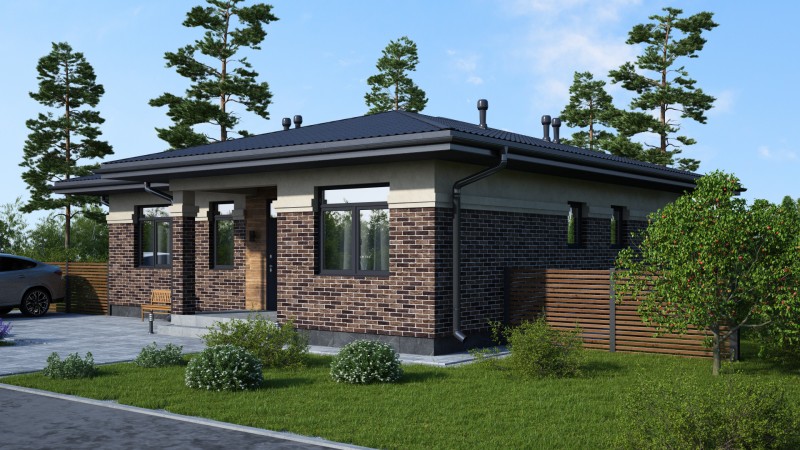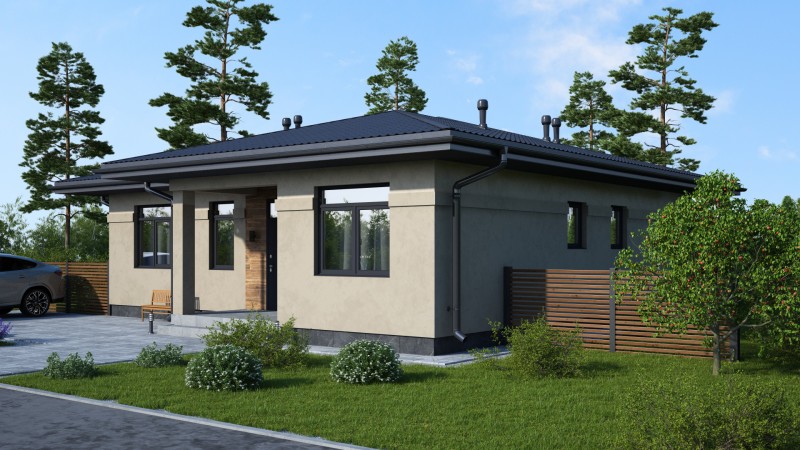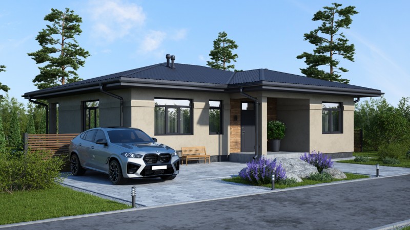 Красивый большой одноэтажный дом с оригинальными комбинированными фасадами, интересной кровлей. Имеет три спальни, одна из них мастер спальня с гардеробной и санузлом, просторную кухню гостиную с выходом на террасу, котельную-постирочную, второй санузел, закрытое от осадков крыльцо и просторную террасу.