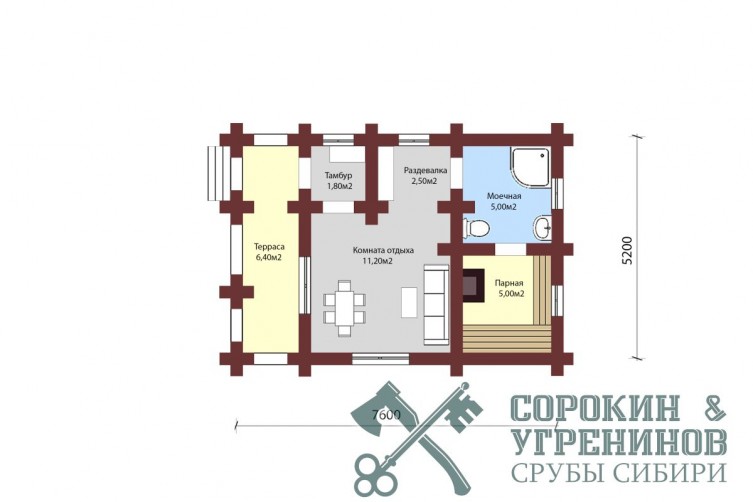 Сруб бани рубленый из бревна кедра диаметром 280-320мм, площадью 31,9м2. Размер сруба 5,2х7,6 метров по осям. Удобная планировка бани, парная, душевая, комната отдыха, санузел, тамбур, терраса. Сруб рубленый вручную в русскую чашу (охлоп), бревна окоренные гидро-окоркой (водой под высоким давлением), а так, же это можно сделать скобелем или лопатой, или строганное рубанком. Объем бревна в срубе 44,1м3. Баня была установлена в Новосибирской области в поселке Мочище в 2013 году.