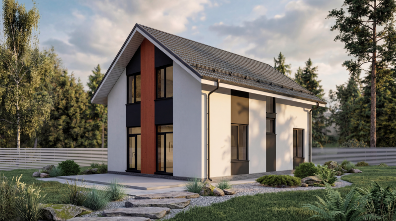 Отделкка фасада - декоративная штукатурка с элементами дерева из планкена