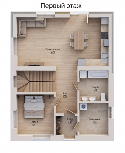 Внутри предусмотрены: котельная, прихожая, холл, 4 спальни, два санузла, гардеробная и кухня-гостиная.